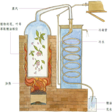 我们所熟知的精油,一般是通过从植物的叶子、花朵、种子、果实、根部、树皮、树脂、木材等以蒸馏法、冷压榨法、脂吸法或溶剂萃取法,提炼出来的物质。除了单一部位可萃取出精油外,有些植物可以在好几个部位萃取出精油,例如,苦橙就可从花苞、叶子及果实三个部位萃取出精油。 蒸馏法 蒸馏法操作最简单,成本较低,目前市面上95%的精油都是由蒸馏法萃取而得的。 方法是将新鲜的或经干燥处理的芳香植物原料(碎木屑、花朵、叶片等)放到蒸馏器中,由下方加热送入蒸汽将植物的精油蒸发出来。含有精油的水蒸气经由导管收集冷却后,会冷却成液体,再因水与精油的比重、密度的差异而分离出来。 蒸馏法多用于萃取部位为根、茎、花朵及叶片的植物。在冷却过程中,循环的水可多次使用,剩下来的水分当中,或多或少都有些精油溶在里面,就是所谓的“花水”,有的厂商把它表示为“纯露”。 用蒸馏法萃取的精油 罗勒、胡萝卜籽、洋甘菊、肉桂、快乐鼠尾草、芫荽、丝柏、尤加利、天竺葵、杜松子、薰衣草、香蜂草、橙花、广藿香、欧薄荷、保加利亚玫瑰、迷迭香、花梨木、檀香、茶树、马鞭草、伊兰伊兰。